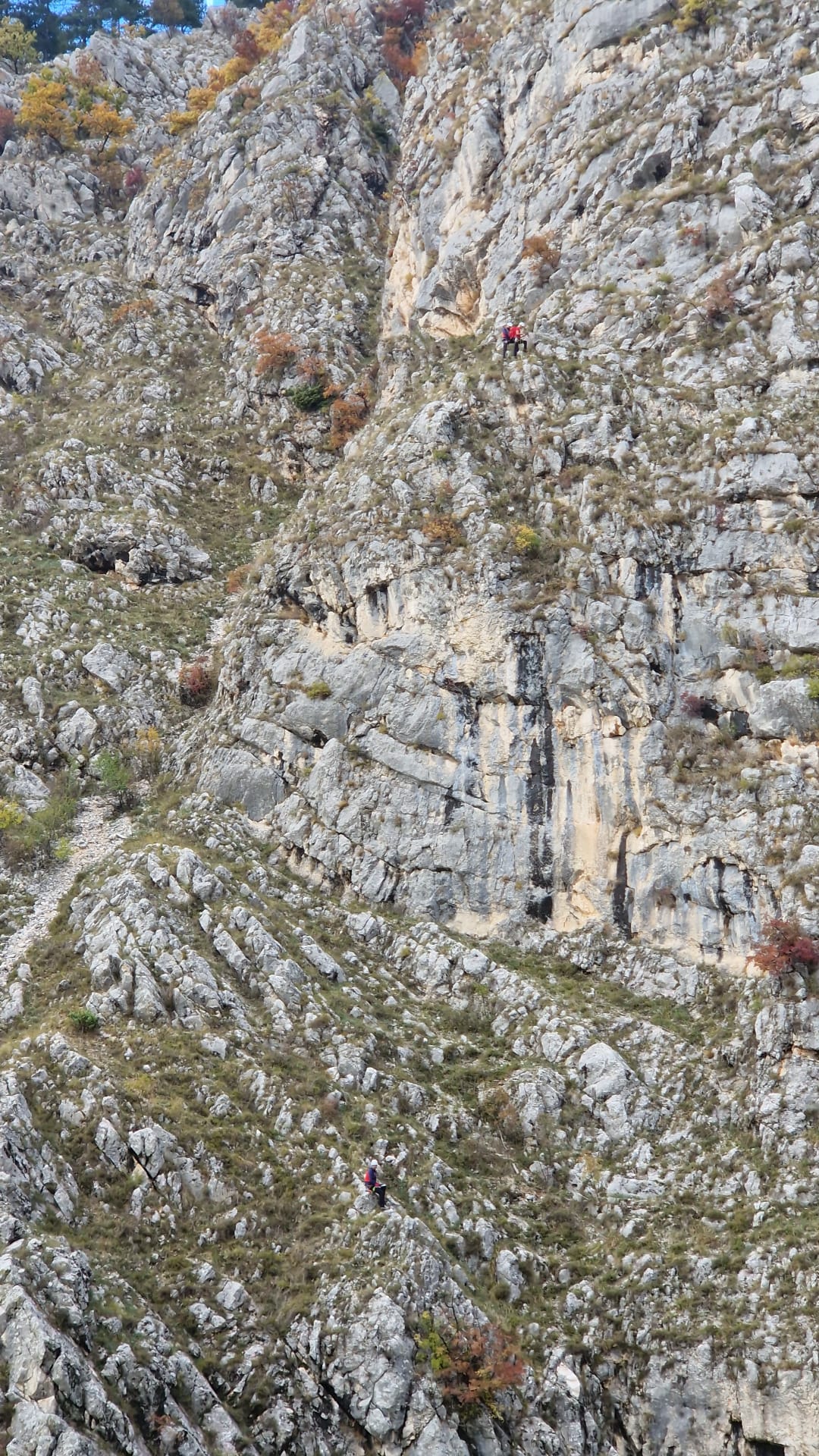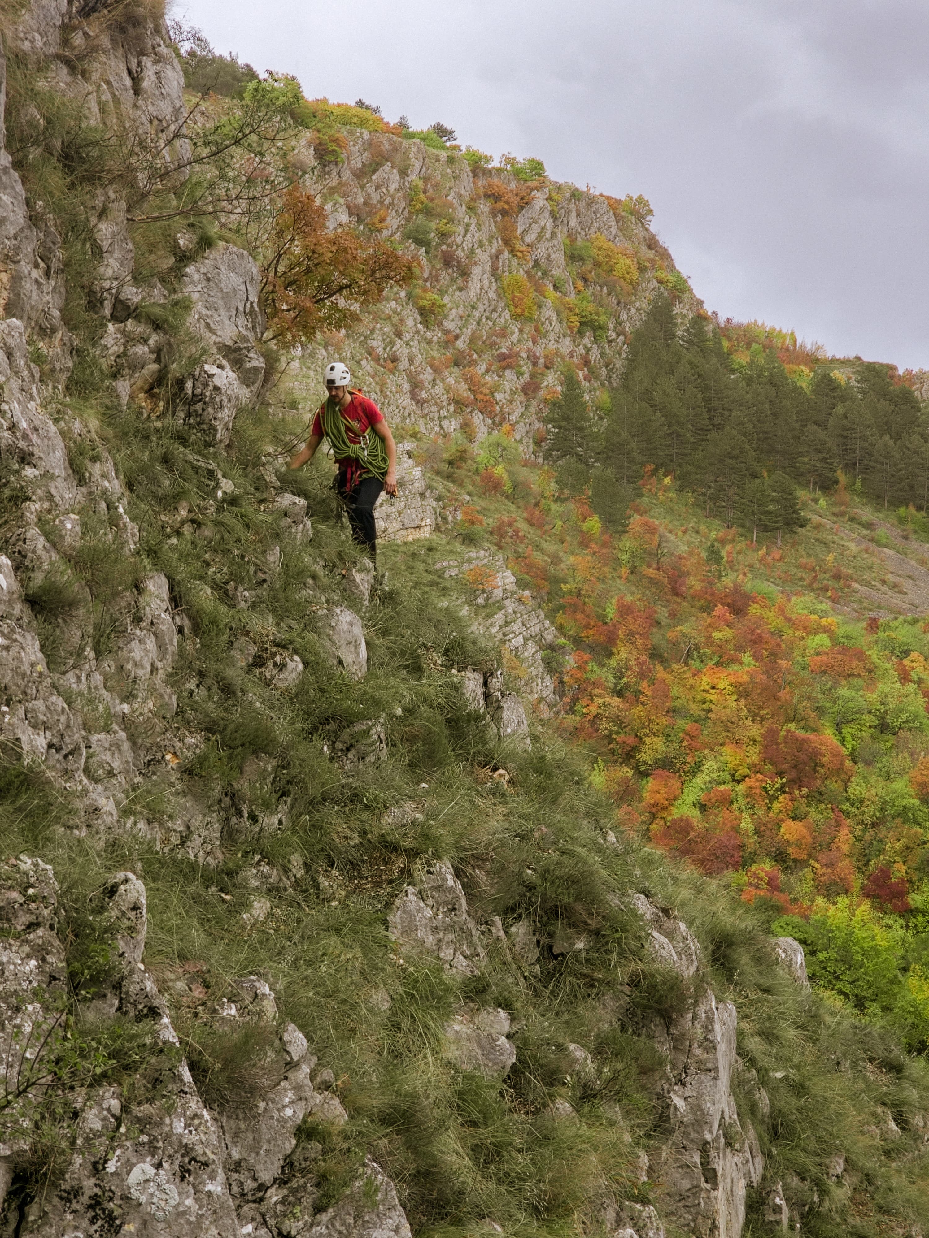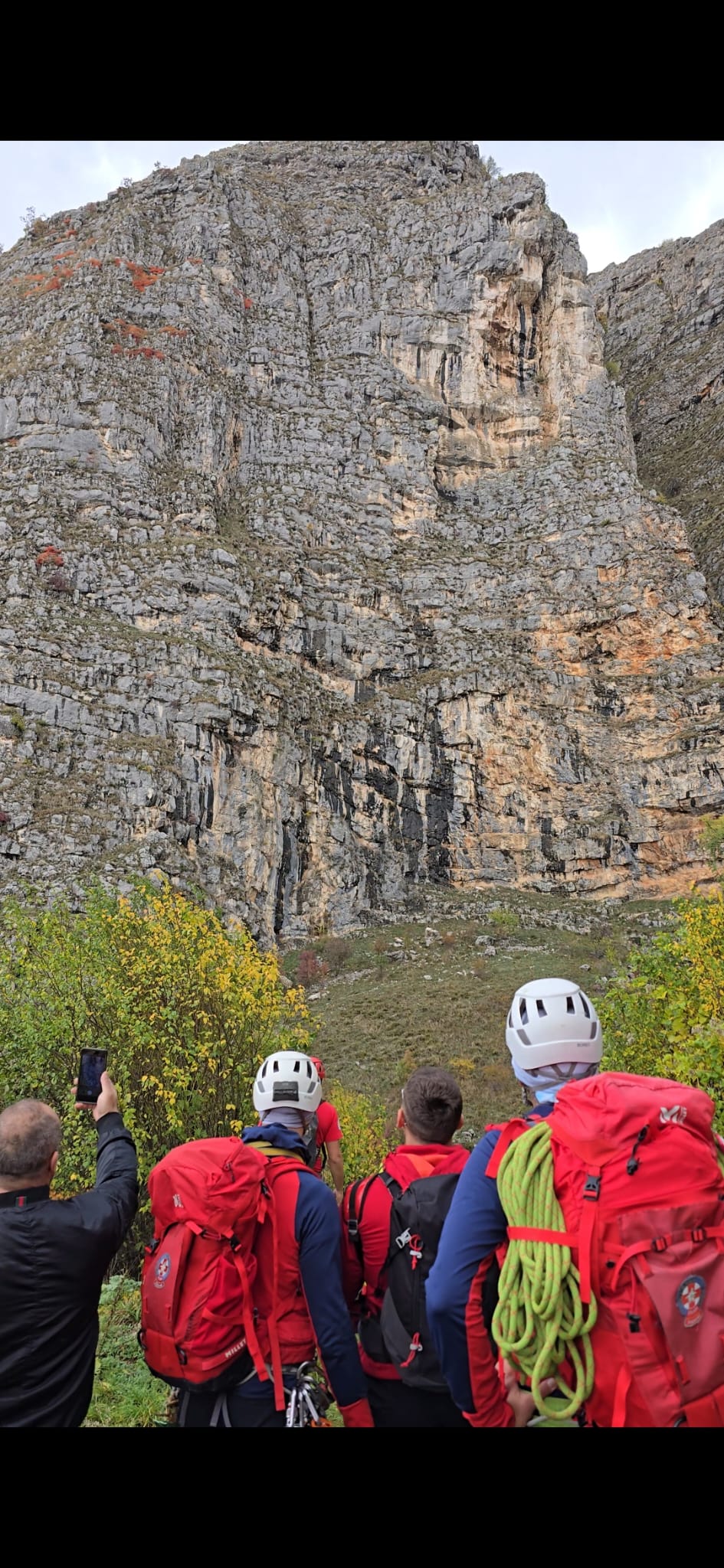 Unatoč kišnoj i tmurnoj nedjelji, šest spašavatelja naše stanice ubrzo se okupilo i izašlo na teren. Pas se nalazio na polici oko 40 metara visoko u stometarskoj stijeni. Odlučili smo se na paralelni uspon siparom, a zatim priječili stijenu kako bismo se spustili točno iznad njega.