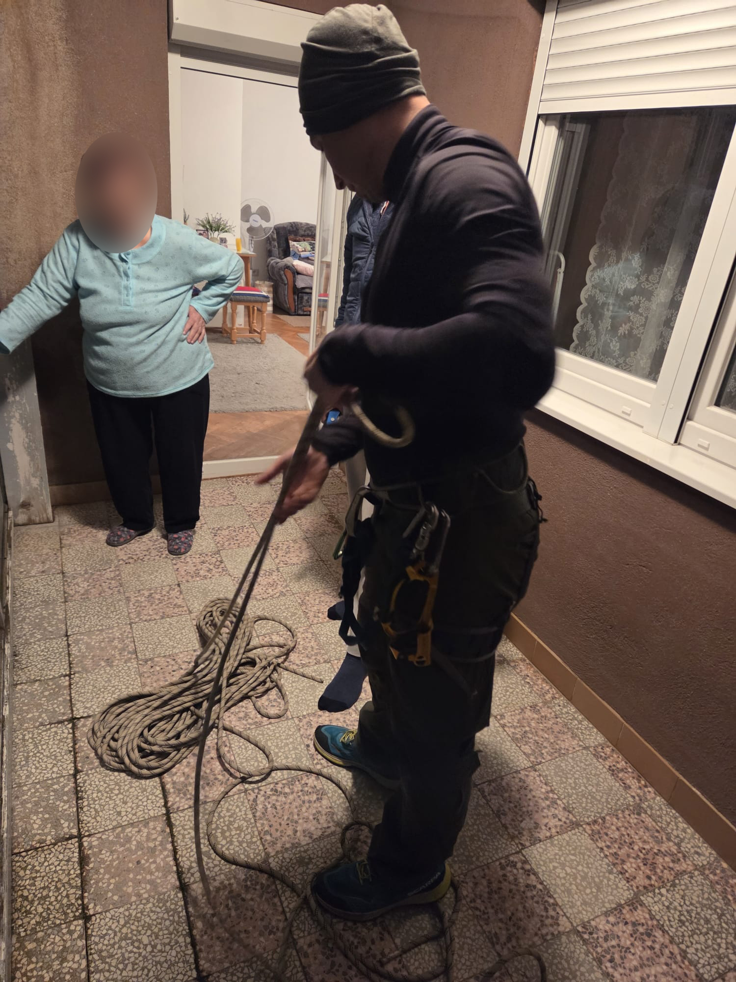 15. travnja, na poziv člana obitelji vlasnice stana (dementna osoba) odradili smo spuštanje sa zgrade na balkon stana, kako bismo otključali ulazna vrata stana koja se nisu mogla otvoriti s vanjske strane. Uzimajući u obzir sve okolnosti, odabir rješenja problema u ovoj situaciji se pokazao dobrim, bez ikakvih posljedica i štete.